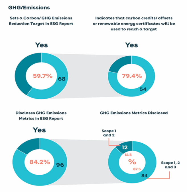 Of the companies that disclosed their alignment with UNSDGs, the most common of the UNSDGs cited were climate action (86.3 percent), gender equality (82.4 percent), and decent work and economic growth (82.4 percent). The ESG Reports discussed a variety of topics including, among others: employee matters (98.3 percent of companies), community engagement (96.5 percent), ethics (90.4 percent) and diversity (90.4 percent).